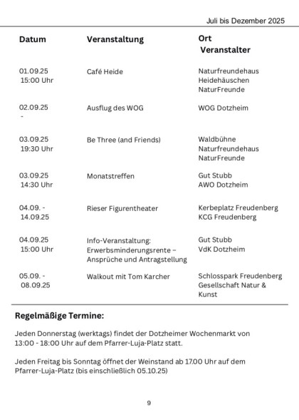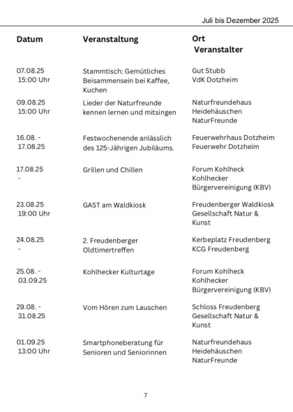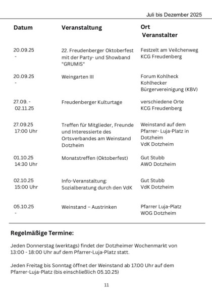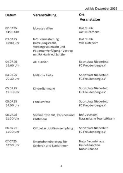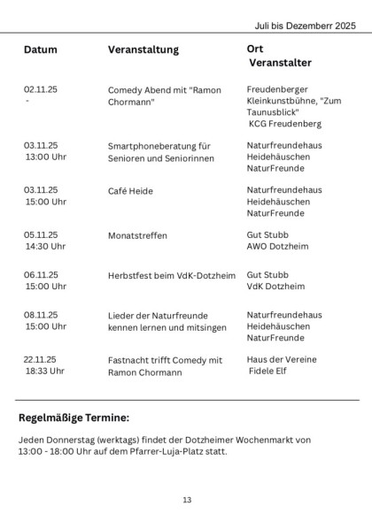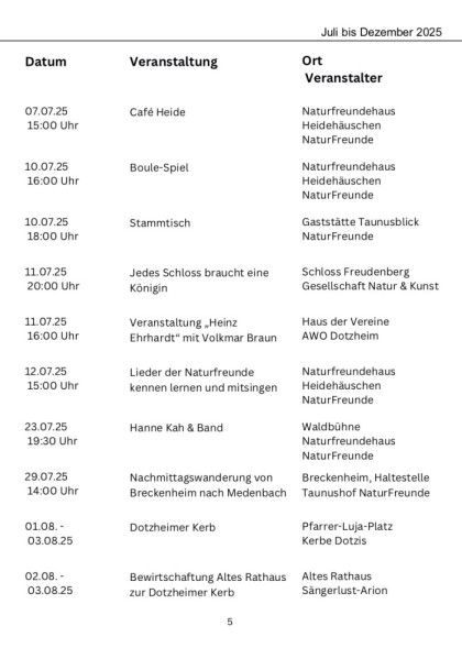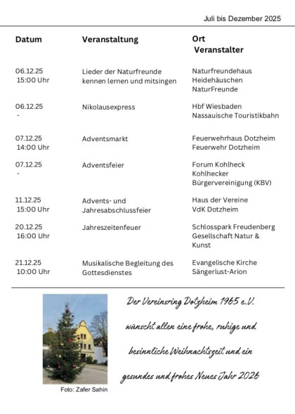 Liebe Mitbürgerinnen und Mitbürger, der Stadtteil Dotzheim besteht aus vielen Ortsteilen. Ob im Märchenland, Freudenberg, Kohlheck oder Schelmengraben, ob im alten Ortskern oder im Sauerland, überall beleben Vereine das tägliche Miteinander. In allen Teilen Dotzheims finden verschiedene Veranstaltungen statt: Lesungen, Weinproben, Fastnachtsitzungen, Feste, Kerben und vieles mehr. An den Vereinsring Dotzheim wurde die Bitte herangetragen, Informationen über Veranstaltungen in den Dotzheimer Ortsteilen zusammenzutragen und allen Interessierten zur Verfügung zu stellen. Wir stellen Ihnen die Termine des 2. Halbjahres 2025 hier zur Verfügung (bitte nach unten scrollen). Bernd Nies 1. Vorsitzender Vereinsring Dotzheim e.V. |